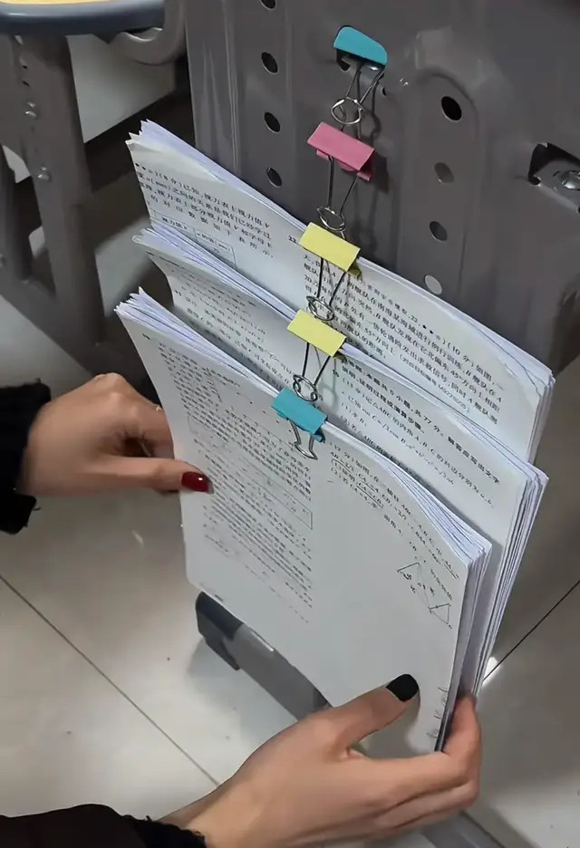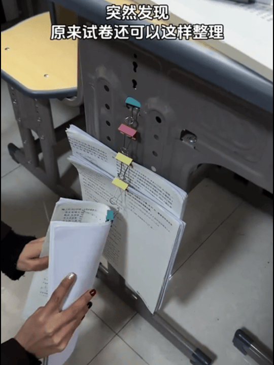试卷再多也不拍,可以把长尾夹侧一下挂在上一个夹子上,这样一摞摞试卷就叠起来了,很好整理,能快速分类固定,而且成本还很低。