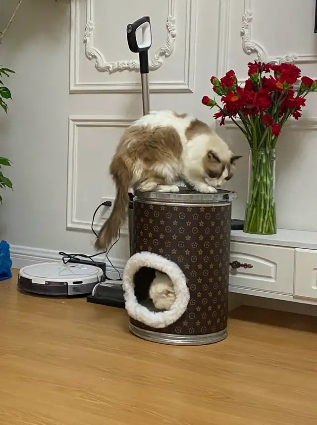 还能用它DIY猫窝,侧边开半圆门,里面放小猫咪玩具,萌宠专属“别墅”。